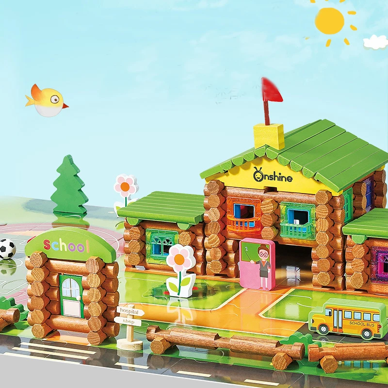 Onshine DIY House 240/270pcs Wooden Lincoln Logs Hospital school Building Blocks with Puzzle Scene