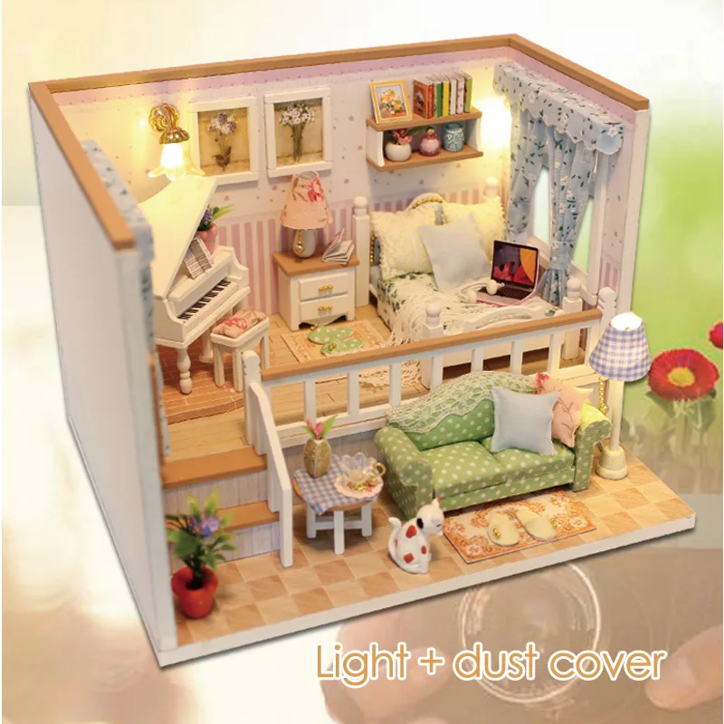 ORIGINAL DIY 3D Light Furniture Dust Cover Wooden Miniature House Because I Met You Dollhouse Toys for Child